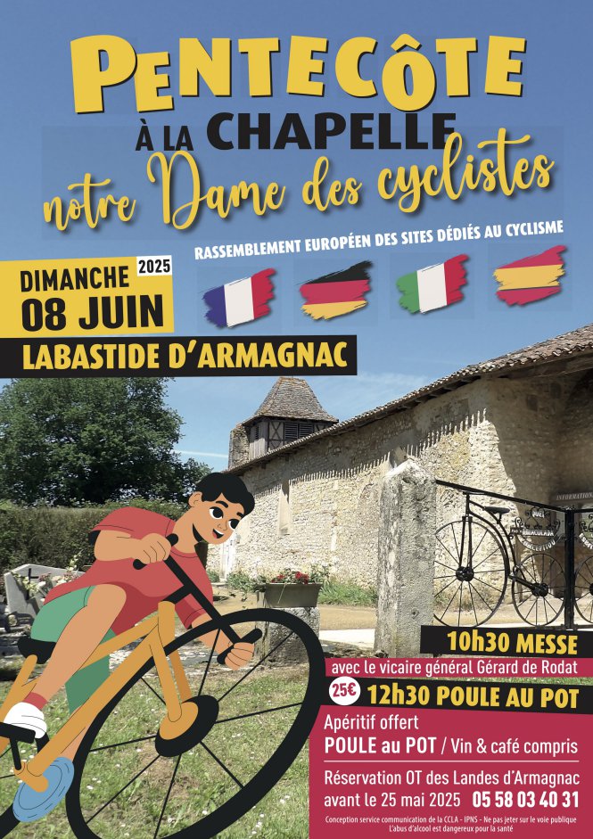 En 2025, une messe sera célébrée le jour de Pentecôte, dimanche 08 juin, présidée par l'évêque, Mgr Nicolas Souchu, à 10h30. Elle sera suivie d'un apéritif offert. Un repas se tiendra également, sous chapiteau, proposant aux convives une poule au pot (Prix du repas : 25 € / Réservations auprès de l'Office de Tourisme au 05 58 03 40 31, jusqu'au 25 mai au plus tard).